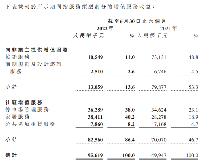 来源:第一服务公告 公告显示,受房地产市场低迷影响,第一服务绿色人居解决方案中的系统安装服务、绿色科技咨询服务及恐龙系列产品销售等业务均出现收缩,产生的收入不及去年同期。此外,向非业主提供的增值服务包含协销服务、前期规划及设计咨询服务,其产生的收入分别下滑85.58%、62.79%。