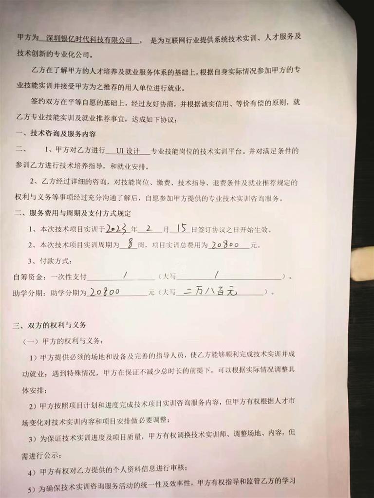 ▲涉嫌“招转培”的合同条款。 未投简历却获面试邀约 要求试岗还要交培训款 小彭是“00后”,今年初想要转行做平面设计,由于专业不对口,又缺乏相关经验,她只能将简历投向助理类工作,大多备注条件是:无条件、新人可接受。很快,小彭接到了来自深圳某亿时代科技有限公司的面试电话,后来HR加了她的微信并将面试地点发给她。小彭翻看自己投送简历的记录,却发现自己并未给这家公司发过简历。 不想放弃面试机会的小彭在查阅了该企业的工商信息后前往面试。等待面试时,小彭注意到,这一次跟自己一同面试助理岗位的有6个人。开始面试时,面试官就要求试岗,称这是对求职者的能力测试。两天试岗结束后,便进入了正题——培训课程推销。轮番攻势下,小彭与深圳某亿时代科技有限公司签订了技术实训与就业协议,实训周期为8周,价格为20800元,付款采用的是第三方贷款平台,小彭每月需要还款约1700元。 协议表明:深圳某亿时代科技有限公司将为答辩成绩合格的乙方免费提供就业服务。小彭告诉深晚记者,职场小白或转行新人求职艰难,“包就业”这一条款便是让人上套的最好饵料,小彭培训的同期学员约有20个,均为“00后”,应届生居多。 培训两周后,小彭发现除了老师和一同培训的学生,自己竟然从未见过其他员工,意识到自己被套路了。今年4月6日,小彭在深圳市龙岗区人民法院对深圳某亿时代科技有限公司提起民事诉讼。 8月7日,深晚记者通过商业查询平台调查发现,该公司成立于2022年1月,目前尚无企业风险提示。深晚记者致电平台上该公司所留电话号码,发现提示语为其他公司,且无法实现接通。