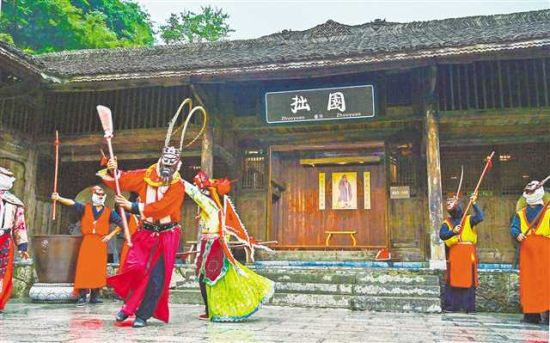 酉阳桃花源景区,陈永霞等人正在唱阳戏。(重庆日报资料图片)通讯员 邱洪斌 摄视觉重庆 ■阳戏又称脸壳戏、面具戏,因演出时演员佩戴各种形式的木质面具而得名,距今已有3000多年历史 ■清泉村的阳戏人平均年龄超过65岁。更多的年轻人,在生计面前选择了“摘掉面具” ■他们总是寻找一切机会展示阳戏,哪怕只是几分钟的一次亮相……2021年,面具阳戏正式成为“国宝” 夜未央,阳戏已散场。 月华如水,剧终人去,独留生旦净丑台前幕后收拾家当。 面具未摘、妆未卸,戏里叱咤风云、运筹千里的角儿,已在惦记自家田里的稻谷今年收成几何。 酉阳苗族土家族自治县铜鼓镇清泉村,山环水抱。村如其名,即使今夏连晴高温,也清泉汩汩从不缺水。妥妥的又是一个丰收年。 可阳戏,却不复当年盛景。 “偶有人请,一年有个十几场,更多的是县里几分钟的表演。”月明星稀,秋风微凉,74岁的冷定祥轻拭旦角妆容,不由忆及当年盛况——那可是一年有100多场演出,一出剧两个多小时,一场戏能连唱三天两夜的盛事。 临时阳戏班 化妆、穿上戏服、戴上面具,他们从田间地头走上戏台 白露时节,天气转凉,雨水总在不经意间光顾。 雨天,如今对于69岁的阳戏掌坛师陈永霞来说,有些过于清闲。 “谷子收得差不多了,也没戏唱,就闲着了。”院子里,陈永霞闲坐桂花树下。桂花树年过半百,枝桠间又一次孕育着花苞,“再下一场雨,这花就该香飘十里了。” 阳戏,也曾“香飘十里”。 “哪家有个红白喜事,都要请我们去唱一台,十里八乡都要赶来看戏。”在清泉村,陈永霞的另一个身份,是面具阳戏非物质文化遗产代表性传承人。得益于从小的耳濡目染,20多岁时他就接过了阳戏传承的重担。 阳戏,又称脸壳戏、面具戏,因演出时演员佩戴各种形式的木质面具而得名,距今已有3000多年的历史。至今,阳戏依旧留存有剧目200余个。 冷定祥、石茂昌、陈永胜、冉井尧、杨秀芹……陈永霞掌坛的戏班子,曾有70余名成员。农忙时,他们扛起锄头,披上蓑衣,辗转于农田山野,为了生计奔波不停;农闲时,他们戴上面具,放下幕布,几个人就是一台戏,唱出人间百转千回。 每当陈永霞召集,散落于田间的阳戏人,就会放下手中的农活,迅速归队。 8月底,酉州古城里,陈永霞带着戏班,受邀进行一场几分钟的阳戏展演。 “凡兵权你来演名将杨文广,杨金花由冷林锴来,杨八妹……”演出时,冷定祥成了陈永霞的左右手,拿出剧本翻到《穆桂英挂帅》,迅速为剩下的演员分配角色。 拿到角色的演员听令而去,化妆、穿上戏服、戴上面具,他们从田间地头走上戏台。 戏台一侧,四人组成一支伴奏乐队,敲打声吸引着人们驻足观望。一张幕布隔出台前幕后,斜戴木质脸壳的角色鱼贯而出,高亢的唱腔穿透云雨。 “穆桂英53岁又出征,只因文广抢帅印……”锣鼓声声唱词起,冷定祥掐着声线来到台前,步调带动衣裙翩翩,一招一式利落干练,把穆桂英的刚烈直爽演活…… 千年木面具 做工精良、表情生动的面具,都是阳戏人一刀一刀雕刻而成,凝聚着无数心血 午后,斜阳微醺。 陈家院子老屋,就着门外洒下的日光,冷定祥戴上老花镜,一刀一锤细细雕刻,白杨木上一张人脸已渐成型。 几个月前,冷定祥雕刻的全套32张阳戏面具,被龚滩古镇以2.4万元的价格买去收藏。 “阳戏面具,都是阳戏人一刀一刀手工雕刻的,雕刻技艺代代传承。”冷定祥身边,45岁的冉诗成细细聆听、仔细琢磨。 身后,陈家院子老屋里,有一间房常年落锁,也时常有人出入维护,阻挡时间的啃噬,也阻止世人的遗忘。 在自家屋顶晾晒了谷子,寻得钥匙,陈永霞推开房门,搬出两个箱子。 锁开箱启,全套32张做工精良、表情生动的木质面具,浓缩着千年技艺,代代相传,在阳光下诉说着光阴的故事。 箱子底部,陈永霞翻出一张猴子面具,端详许久。 “从记事起就有这张面具,(它)比我们任何一个人年纪都要大。”木质面具,经年累月总有损毁,可陈永霞手里的这张猴子面具,据说已传承千年。 和所有阳戏面具一样,猴子面具由清泉村常见的白杨木制成,制作技艺同样传承千年。 “新鲜白杨树,砍树锯段,反复入水浸泡和晾干,至少需要一个月时间。”摩挲着一张张精美的面具,陈永霞娓娓道来,“然后选取不开裂、无虫蛀的白杨木,开始雕刻……” 面具雕刻,并不轻松,熟练如陈永霞和冷定祥,也须小心翼翼,“特别是眼睛,一刀不对,就全废了。” 全套32张面具,雕刻一张一般耗时6至7天。 “那还是地里的活路都不做,安安心心才能雕出来。”年过七旬,冷定祥戏称自己已从田里“退休”,可以专心雕刻面具,可年岁渐长,眼睛、手脚已日渐不听使唤。 唱、念、做、打样样精通,生、旦、净、丑四种角色任意切换的陈永霞,也是雕刻阳戏面具的能工巧匠,可陈永霞也已近古稀之年。 还有年过八旬的石茂昌、陈永胜、冉井尧,68岁的杨秀芹……岁月将青丝染成秋霜,也将阳戏的盛世尘封。 冷落与坚持 “完整、准确地把祖辈传授的技艺,毫无保留地教给想学的人” 不知从何时起,阳戏不再是当地群众生活中不可或缺的一部分。红白喜事的热闹,更多由现代的演艺团队充实。 “一年演不到几场,一场百多块钱。”年逾不惑的冉诗成,是戏班里为数不多的“年轻人”,“打小跟着戏班走村入户、挑担帮忙,对阳戏还是喜欢。” 可更多的年轻人,在生计面前选择了“摘掉面具”。 清泉村的阳戏人,平