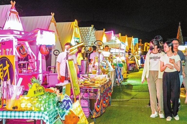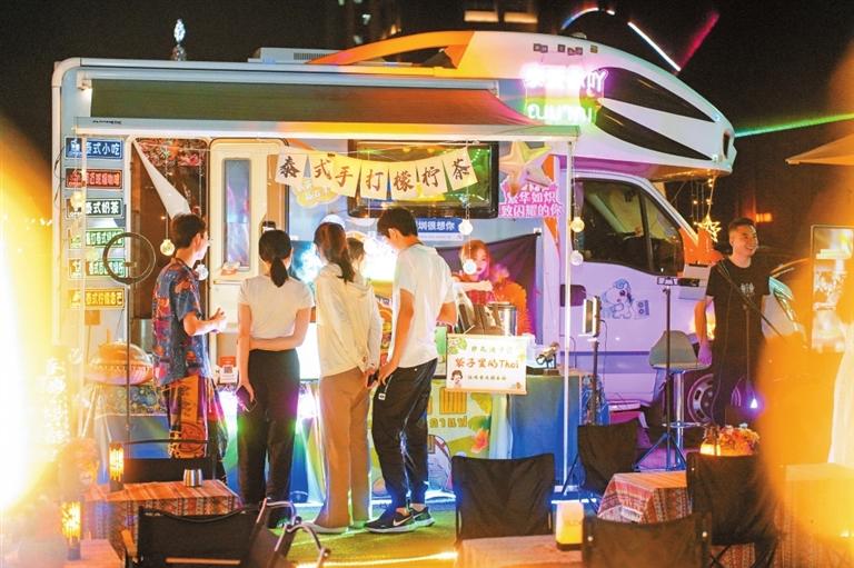 6月15日傍晚,天还没黑,不少摊主已经早早就位。他们将汽车整齐排开,用彩灯将车尾箱装扮成一个个精致摊位的“门面”。近期,位于深圳龙岗茶博园的103车尾箱集市成了深圳市民心中的网红夜市,这种夜间消费新场景吸引了许多市民前来游玩打卡。 21时许,凉爽的风吹过,网红夜市灯火通明。许多年轻人来到集市后,会选择在某个摊位前小坐片刻,听一曲歌手弹唱,再点一杯饮品。每一辆车的后备箱就是一个浓缩版的小门店。整体来看,现调鸡尾酒、现磨咖啡、手打柠檬茶等饮品类摊位居多,也有摊主摆卖烧烤、甜品、文创产品等,小小的车尾箱摊位,承载了丰富的业态。 从形式看,很多摊主都会在摊位旁的空地上摆上简约的折叠桌椅、打开LED补光灯、播放流行音乐、贴上新潮销售推广语,还有讲究的摊主会拉起天幕,挂上小夜灯,靠营造氛围感吸引顾客。这里还有一方小舞台,有才华的摊主和顾客常在舞台上用音乐互动,气氛热闹又融洽。 “夏天到了,我们这里从傍晚开始热闹,周末的话会更早,一般要忙到凌晨。”奶茶摊的摊主告诉深晚记者,她一边忙活,一边还在社交平台直播自己的摆摊生活。她平日从事一份“朝九晚六”的工作,只要有空就会来此参加集市摆摊。