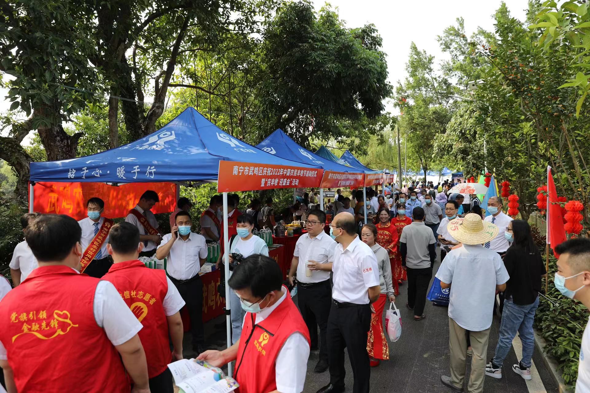 来到岜旺屯戏台旁,武鸣区科技、农业农村、市场监督、卫健、司法、社科等部门集中开展科技下乡科普宣传、农产品质量安全宣传、“送医下乡”、“乡村振兴、法治先行”普法宣传等科普志愿服务活动,宣传“三农”惠农相关政策,进一步推广农业科技,助力乡村振兴。 在岜旺屯戏台旁,广西天润人力资源开发有限公司、南宁武鸣牧原农牧有限公司等6家公司送岗下乡,在丰收节活动现场开展“就业帮扶·促丰收”现场招聘会,通过“面对面”宣传,将岗位、政策直接送到群众家门口,力促群众在“家门口”快速就业。