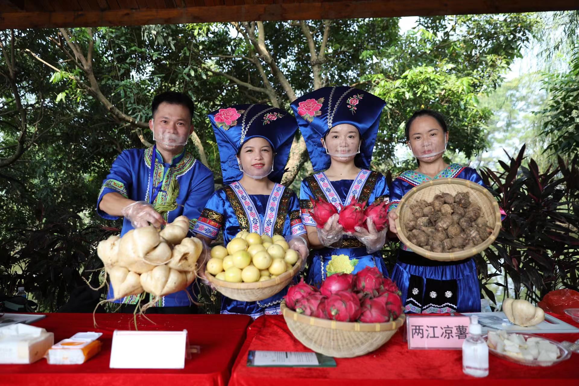 丰收的日子少不了美食助兴。活动现场,活动主办方精心准备了五色糯米饭、红薯、玉米、芋头、八宝鱼生、艾馍、五彩馍等本土非遗美食和凉薯、百香果、火龙果等本地当季水果,以及两江镇得天独厚的大明山水、大明山茶供人品尝,通过美食感受“壮乡美味”,共话丰收年景。 品完美食来到岜旺屯球场,本土山歌手以地道的壮族土话演绎原创的《丰收山歌》,歌手们或问、或答、或逗、或赞……现场山歌飞扬、激情回荡,唱出了农民丰收的喜悦心情和期盼丰收的美好愿景。