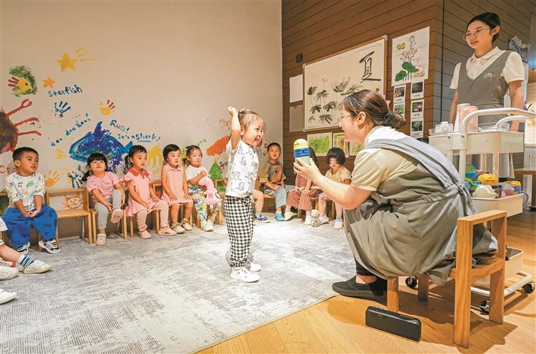 ▲福田区深业幸福家碧海红树创新托育园主题互动课,孩子与老师快乐互动。深圳晚报记者 严文婷 摄 【记者体验】孩子的欢乐从入园就开始 为切实了解托育服务情况,深晚记者来到深业幸福家碧海红树创新托育园,体验了一日托育流程。早上8时开始,就陆续有家长送孩子入园,托育园的老师除了给孩子进行晨检,还会带着孩子们在室外草坪上进行一段早操运动,利用欢乐的律动和互动,唤醒孩子们活力满满的一天。8时30分是孩子最期待的时刻——享用美味早餐。深晚记者看到,托育食谱里有“无糖酸奶”等适合婴幼儿友好的食物,据托育园的老师介绍,该托育园的食谱是由深圳市妇幼保健院专家根据0到3岁的婴幼儿成长发育特点指导设计的,园区还会配备国家注册营养师,根据不同季节、地域环境特点以及婴幼儿生长发育的情况进行及时调整和更新,确保在园儿童身体发展得到充足营养支持。 吃完早餐的孩子,老师会组织在室外的草地遛遛弯,享受阳光、沙池带来的快乐,还会前往格格屋、读书角等教育空间玩耍一下……“看着园区里的孩子自由成长、快乐成长,是我们老师最大的收获。”深业幸福家托育负责人丁灵芝说。 丁灵芝告诉深晚记者,深业幸福家托育目前已在全市7个区进行布局,建成21个托育项目点,共提供1200多个托位。未来,深业集团将会继续加大托育园的建设,为0到3岁婴幼儿家庭提供高品质托育、科学育儿指导服务,并将作为深圳托育示范性项目,为行业提供人才培养、运营标准化体系、保教体系建设。 【保障有力】专业陪护和教育让家长放心 对于双职工家庭而言,托育无疑是一座省心的桥梁,但机构是否有专业的老师,能为孩子成长提供强有力的保障,更是家长看重的。为加强专业学科建设,深圳采取了一系列举措,成立了深圳市婴幼儿照护服务指导中心,开展托育机构负责人、保健员、保育员等从业人员培训和考核,让托育照护更规范。同时还成立了深圳市托育服务协会,发挥好行业的监督自律作用。 “托育园位置在社区附近,接送非常方便。老师专业细致有亲和力,跟家人一般自然温暖。而且它在深圳有很多家示范园,整体口碑很好,让我很放心。”孩子安安在芽咪·格林婴幼学苑进行托育的家长回忆说。 谈及安安的成长变化,安安家长说:“首先是生活作息的变化,入托大概半个月后,孩子能比较规律地入睡,语言方面也有很大提升,现在会讲好多话。” 芽咪·格林婴幼学苑的龙岗一园是一家扎根于街道,服务于社区的“民办公助”高品质普惠托育园。自2016年3月开园以来,已有300多个孩子从芽咪毕业,是龙岗区首家普惠性托育示范园,在2023年更被评选为“广东省首批示范性托育园”。
